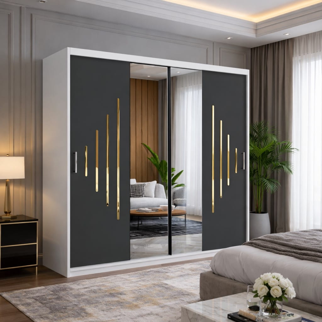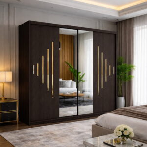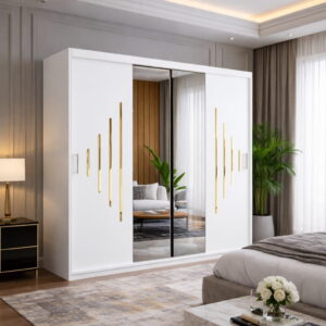 Dressingul VOLA 200 cm cu accente aurii este alegerea ideală pentru un dormitor modern și elegant, oferind spațiu generos de depozitare, design premium și un aspect sofisticat care atrage imediat atenția.
