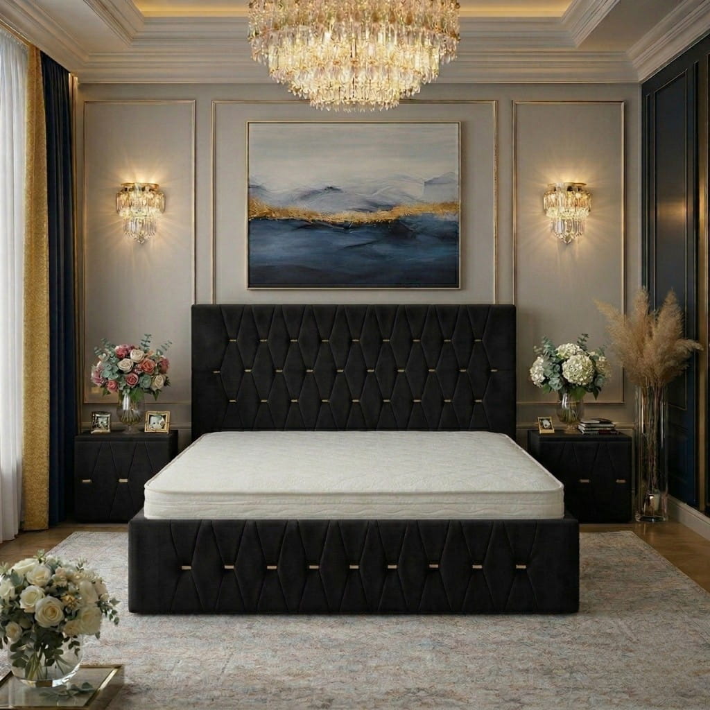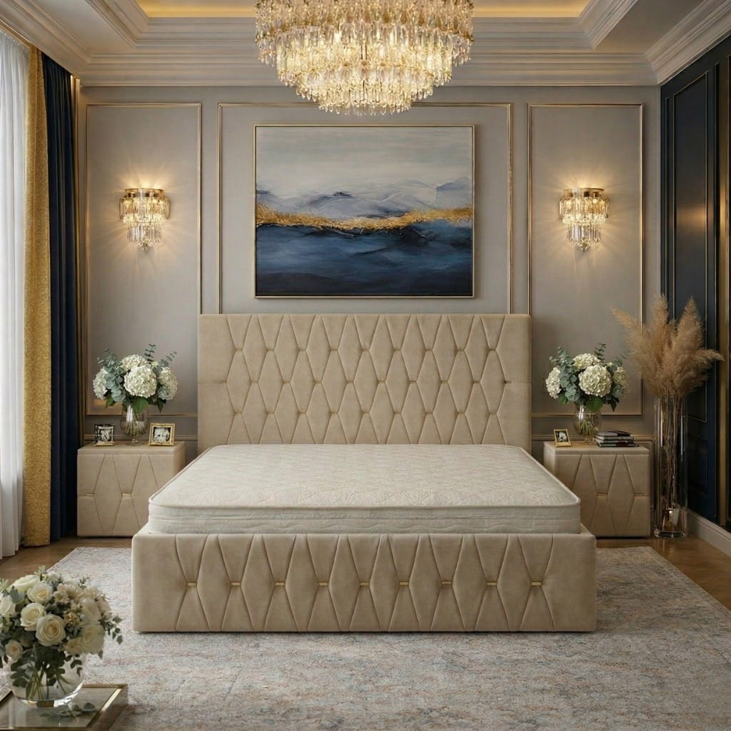 Patul tapițat ANA cu 2 noptiere tapițate este alegerea ideală pentru un dormitor elegant și armonios, oferind un design modern, confort superior și un aspect premium care transformă complet spațiu